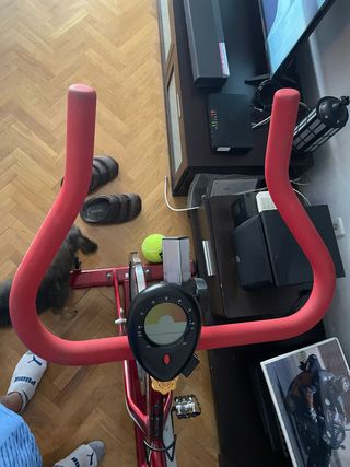 Indoor Cycle professionale Serie GR7 Horizon in ottime condizioni, ideale per allenamenti a casa. Ritiro autonomo a Roma. Concepita per dare la reale sensazione del ciclismo su strada con sistema di resistenza magnetica, manubrio e sellino regolabili sia in verticale che orizzontale, pedali con attacco rapido e tradizionale con gabbie. Telaio solidissimo con un peso di 51 Kg e portata massima fino a 136 Kg. La bici è praticamente nuova, mai usata. E' sul mercato a 1400€. Unico difetto è la cinghia rotta del pedale destro (regalo del nostro cagnolino!), difetto che non intacca minimamente la pedalata