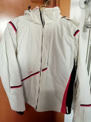 Ottima giacca da sci e non solo, indossata poche volte, tasche e taschino utili per sciare e non solo. Color panna con inserti rosa e nero. Ottima vestibilità donna