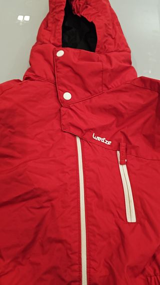 Tuta da sci rossa per bambino, taglia 12 anni / 152 cm. - Cappuccio integrato. - Chiusura frontale con zip bianca. - Polsini elasticizzati. - Tasche applicate sulle gambe.