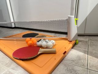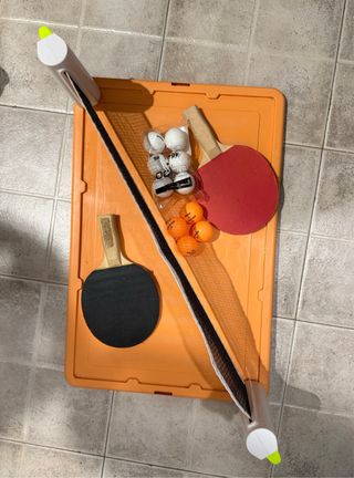 Set completo per il gioco del ping pong, ideale per divertirsi. - Rete da ping pong con supporti. - Due racchette. - Palline da ping pong incluse.
