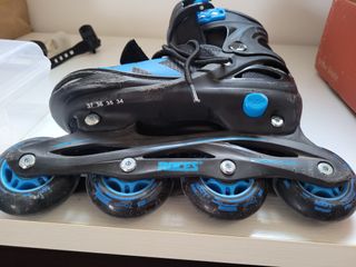 Pattini in linea Roces da bambino regolabili dal n. 34 al 37 usati pochissimo. Completi di set di protezioni: para-gomiti, ginocchiere, para-polsi, brugola di regolazione e bullone di ricambio per ruote.