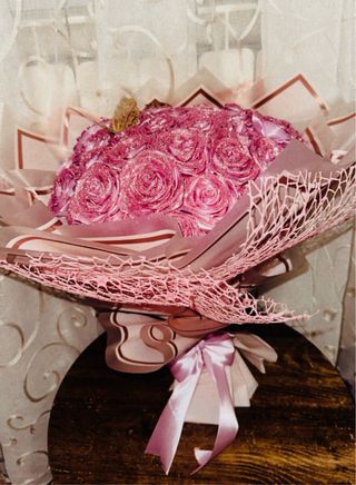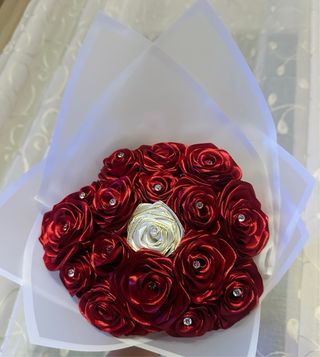 Realizzo bouquet unici e personalizzati, in tutti i colori e stili che desideri * Ogni creazione nasce dalle mie mani, intrecciata con nastro di raso, amore e tanta passione Scrivimi per creare insieme il tuo bouquet perfetto! Bellissimo bouquet di rose realizzate a mano con nastro di raso rosa scintillante. Un tocco di eleganza e romanticismo. - Fiori in raso rosa glitterato. - Decorazione con farfalla dorata. - Nastro di raso rosa per la chiusura.