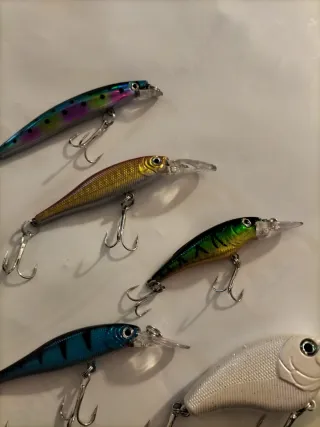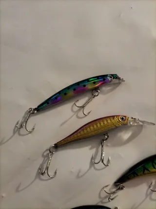 Set di 5 esche artificiali per la pesca a spinning. Ideali per attirare diverse specie di pesci. Vendo anche singoli a 5€ ognuno - Colori assortiti: arcobaleno, oro, verde/giallo, blu/nero, bianco. - Dotate di ancorette per una maggiore tenuta.