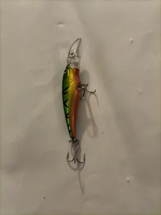 Esca artificiale per spinning, ideale per la pesca. - Colore verde e oro con striature nere. - Dotata di due ancorette.