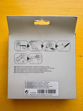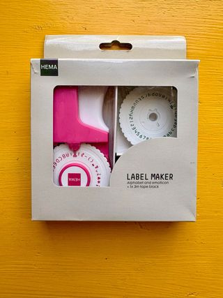 etichettatrice manuale a rilievo HEMA. Permette di creare etichette adesive personalizzate per organizzare oggetti, cibo e documenti. Il testo sull'etichetta viene stampato a rilievo manualmente. Include caratteri alfabetici, numeri ed emoticon. Viene fornita con un nastro nero da 3 metri.