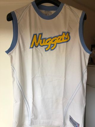 Maglia da basket senza maniche dei Denver Nuggets. Originale, mai indossata (Denver 1995) attenzione: scritte cucite (non stampate) taglia L - Colore bianco con dettagli azzurri. - Logo Nuggets giallo e azzurro sul petto. - Cuciture decorative azzurre sui fianchi e sulle spalle.