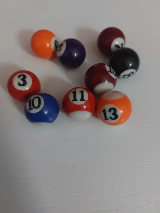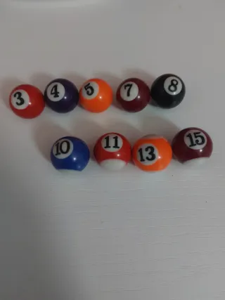 Set di palline da biliardo con numeri. - Pallina numero 3 rossa - Pallina numero 4 viola - Pallina numero 5 arancione - Pallina numero 7 bordeaux - Pallina numero 8 nera - Pallina numero 10 blu - Pallina numero 11 rossa - Pallina numero 13 arancione - Pallina numero 15 bordeaux