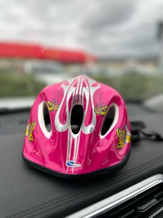 Caschetto protettivo per bambini, di colore rosa acceso con grafiche argentate e simpatici personaggi. - Design colorato e divertente. - Struttura ventilata con aperture.