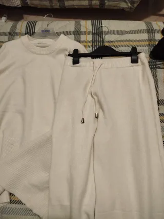 Elegante completo in maglia color panna, perfetto per un look casual chic. - Maglia a maniche lunghe con girocollo. - Pantalone coordinato in maglia. - Dettagli a costine sui polsini e sul fondo maglia. - Taglia S/M
