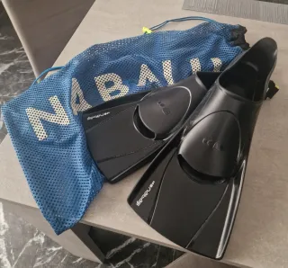 Pinne da allenamento per adulti, taglia 41/42. In ottime condizioni, complete di sacca. - Colore nero. - Marca Nabaiji. - Sacca in rete blu inclusa.