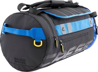 Borsa multifunzionale di colore nero e blu, con manici e tracolla regolabile. Presenta dettagli riflettenti e logo Walrus Duffel Bag impresso. Borsa Multifunzionale Convertibile in Pochi Secondi tra la modalità Zaino e Borsone a Mano, Ideale per attività Acquatiche, Nero/Blu 35 L, Unisex - Materiale resistente. - Design convertibile. - Tasca esterna con zip.