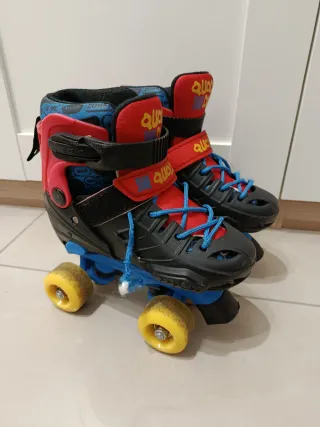 Pattini a rotelle Quoddy per bambini, taglia 31. Perfetti per muovere i primi passi sulle rotelle. - Chiusura con lacci blu. - Design colorato con dettagli rossi e gialli. - Ruote gialle resistenti. Sono usati ma in ottimo stato bisogna solo pulire bene le ruote e se si vuole cambiare i lacci perché si stanno sfilando ma sono ancora buoni