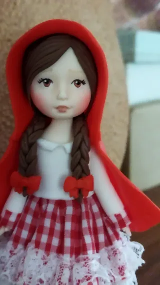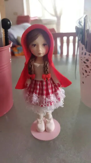 Bambola artigianale che ricorda Cappuccetto Rosso. Realizzata in porcellana fredda. - Vestito a quadri rossi e bianchi. - Gonnellina con pizzo bianco. - Mantellina rossa con cappuccio. - Scarpe rosa. - Capelli castani raccolti in due trecce. Alta 16cm circa.