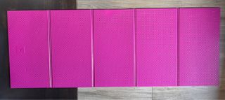 Tappetino per yoga o esercizi, di colore fucsia e con una texture antiscivolo. Misure aperto 60x162. Da chiuso 32x60x5. Ha qualche segno di usura si vede nelle foto. - Pieghevole in 5 sezioni. - Logo Y impresso su un lato. - Superficie con motivo a rombi.