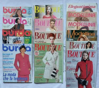 Lotto di 14 riviste di moda complete di cartamodelli. - Include 4 riviste "Burda" 6 "la mia Boutique" 3 Modellina e 1 Elegantissima con testo italiano, francese e spagnolo - ogni rivista contiene i cartamodelli ancora attaccati al centro