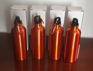 Set di 4 borracce termiche di colore arancione. Nuove mai usate. in confezione originale. - Materiale: alluminio - Tappo nero con moschettone - Ideali per bevande calde o fredde