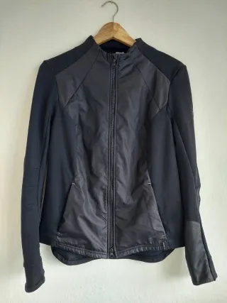 Confezionata in 2 tessuti differenti. Ha 2 tasche chiuse con cerniera nella parte anteriore. L'etichetta con la taglia è stata tagliata, ma veste M aderente Misure: - spalle cm 41 - da ascella ad ascella cm 48 - lunghezza cm 62 parte posteriore e 59 parte anteriore