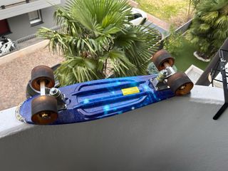 Penny board con un design spaziale blu e dettagli scintillanti. Le ruote sono di colore scuro e si illuminano con il movimento. - Deck con stampa galassia. - Ruote scure. -prezzo trattabile