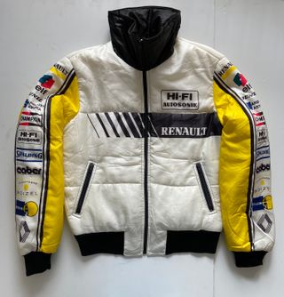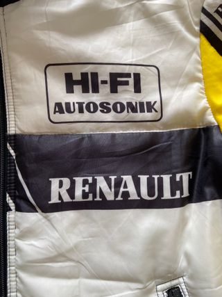Piumino Renault bianco con inserti gialli e neri, da collegare alle corse automobilistiche monomarca, scuderia Arsnova Astrea. Sponsor: Elf, Dunlop, Arsnova Astrea, Champion, HI-FI Autosonik, Spalding, Caber, Champagne Boizel, Bilstein. Collo alto nero e due tasche laterali con cerniera. Tutti i loghi degli sponsor sono stampati Leggera sbavatura di colore nero come indicato nelle immagini. Made in Italy, taglia XXXXL, ma di dimensioni moderate: spalle 50cm - torace 62cm - lunghezza 68cm - manica 69cm. #renault #renaultsport #renaultcinque #renault5 #elf #dunlop #champion #champagneboizelbouchon #dunlop #arsnova #hifi #autosonik