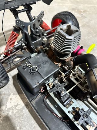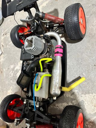 Modello di auto radiocomandata a scoppio. - Motore a scoppio. - Ruote con cerchi rossi. - Scarico cromato con terminale giallo. - Ammortizzatori rossi.