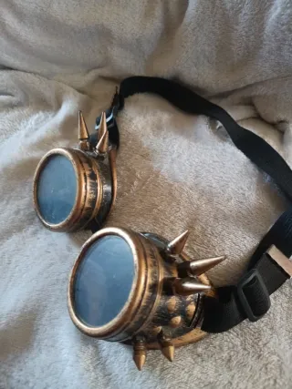Occhiali in stile Steampunk con un design unico. - Montatura color bronzo. - Lenti rotonde scure. - Dettagli con borchie metalliche.