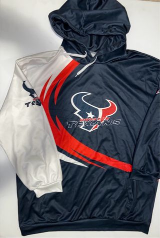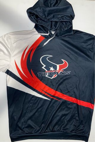 Maglia con cappuccio bianca e blu NFL Houston Texans. Tutti i loghi sono stampati, tascone centrale, taglia 3XL. Sulla maglia ci sono alcune piccole smagliature come indicato (potrebbero essercene altre simili). #houstontexans #nfl #footballamericano