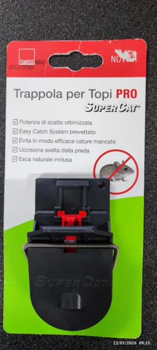 Trappola per topi SuperCat PRO, con sistema di cattura brevettato. - Potenza di scatto ottimizzata - Evita catture mancate - Uccisione rapida della preda - Esca naturale inclusa