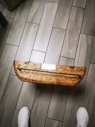 Barchino in legno con finitura grezza e dettagli incisi. Presenta una struttura robusta con due traverse centrali e una barra metallica di rinforzo.mis.del barchino 65cm più trave avvolgi lenza - Materiale: Legno - Dettagli incisi - Barra metallica di rinforzo
