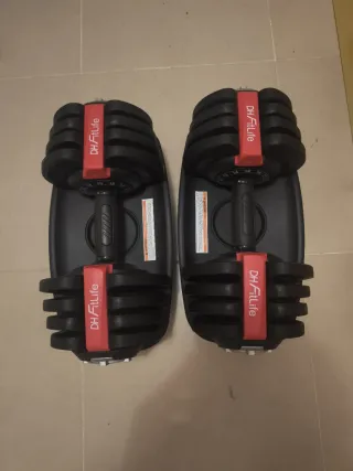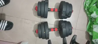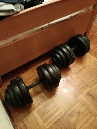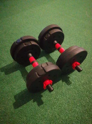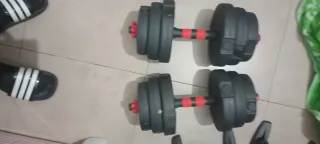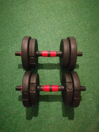 Set di due manubri regolabili, ideali per l'allenamento a casa. Ogni manubrio può essere configurato fino a 10kg o più. Include due barre cromate, dischi di peso (1kg X8) (2kg X4), chiusure di sicurezza per i dischi. Uno è completamente nuovo (Sprinter) e l'altro poco usato ma come nuovo (Domyos acquistato su Wallapop)