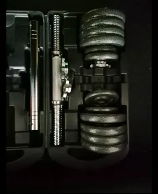 Set di manubri regolabili per l'allenamento a casa. Include tutto il necessario per variare il peso. - Due barre di manubri. - Quattro dischi da 2 kg (4.4 lbs). - Due dischi da 1 kg. - Quattro chiusure a stella. - Valigetta di stoccaggio.