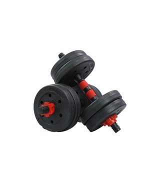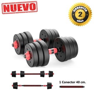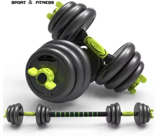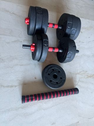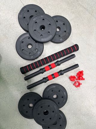 Set di manubri con un peso totale di 20kg. Include barre e dischi. - Manubri regolabili. - Dischi di peso. - Barre con impugnatura.