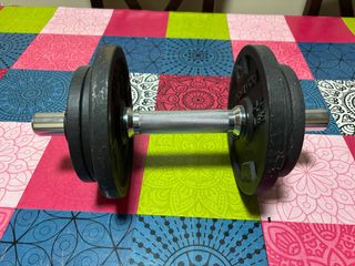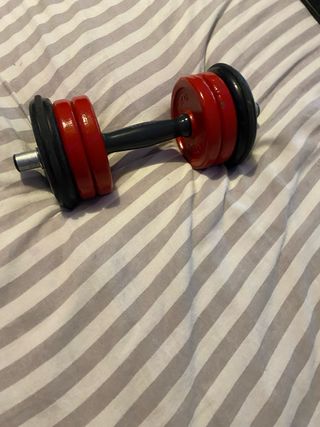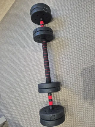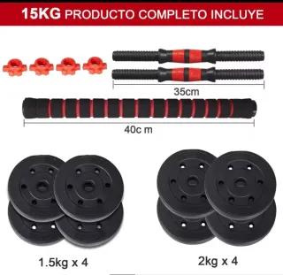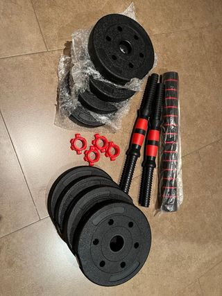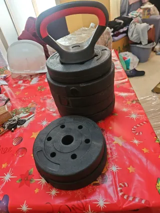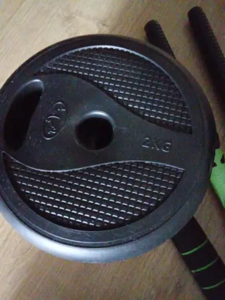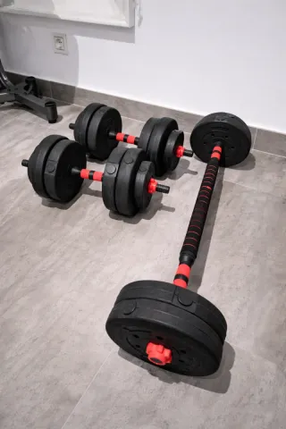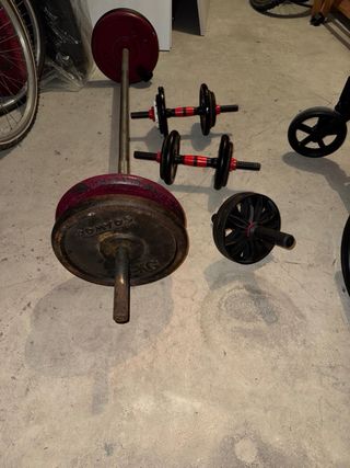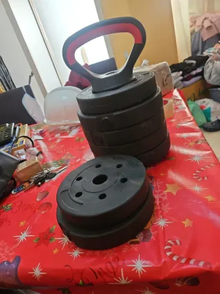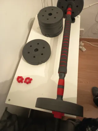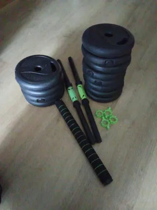 Kit di pesi per l'allenamento a casa. Ho allenato per 1 anno a casa con esso e sono molto soddisfatta, lo vendo perché mi sono iscritta in palestra. Include: - Due barre di manubri con impugnatura antiscivolo. - Un pezzo per unire i due manubri e creare una barra. - Quattro dischi da 2,5 kg. - Quattro dischi da 2 kg. - Quattro dischi da 1,5 kg. - Quattro dischi da 1,25 kg. - Sei chiusure a vite per fissare i dischi. - Un paio di guanti da palestra e un paio di fasce da polso. Per qualsiasi domanda non esitate a scrivermi! Accetto offerte