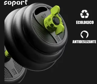 Set di manubri regolabili con un peso totale di 20kg. Il colore principale è verde. Include barre per manubri e barra di pesi. Dischi di peso regolabili. Impugnature con presa comoda.