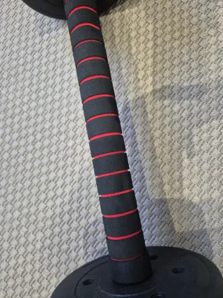 Set di manubri regolabili con dischi di peso. Può essere una barra larga o smontare (senza chiavi) e fare due manubri. - Barra con impugnatura testurizzata. - Dischi di peso neri. - Bande rosse decorative sulla barra.