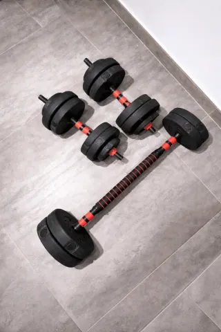 Set di pesi regolabili per l'allenamento a casa. Include due manubri e due barre per diversi tipi di esercizi. - Manubri con dischi di peso. - Barre con impugnatura imbottita. - Dischi di colore nero con dettagli rossi.