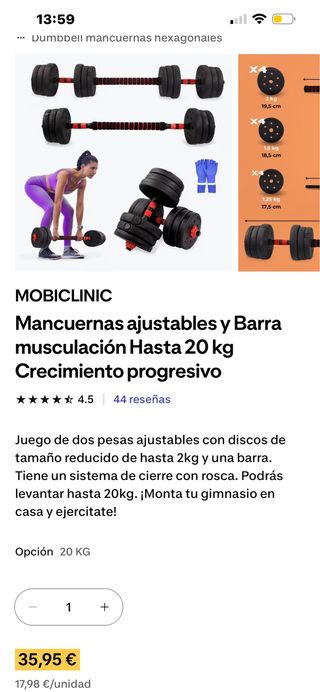 Set di due pesi regolabili con dischi di dimensioni ridotte fino a 2 kg e una barra. Ha un sistema di chiusura a vite. Puoi sollevare fino a 20 kg. Include guanti. La barra può essere allargata inserendo le mini barre dei manubri. La scatola è stata aperta solo per vederlo e non è mai stata usata. Tutto è ancora avvolto. Costo più di 50.