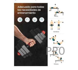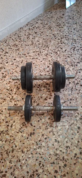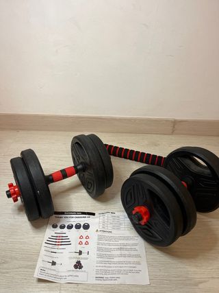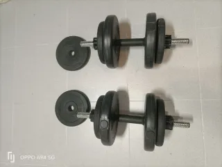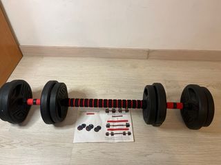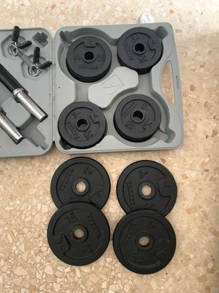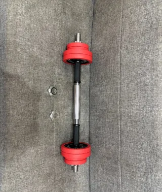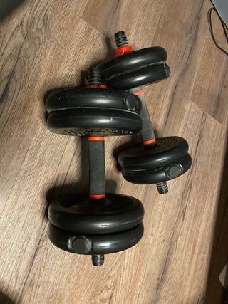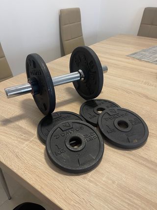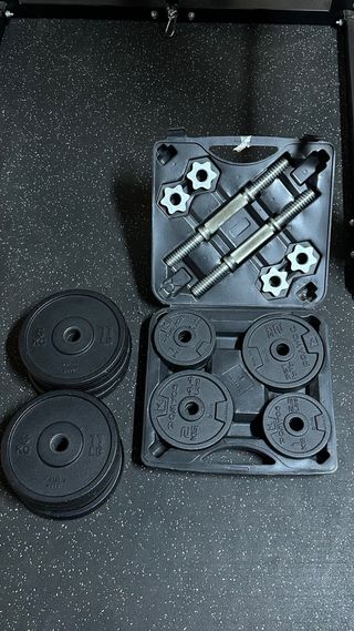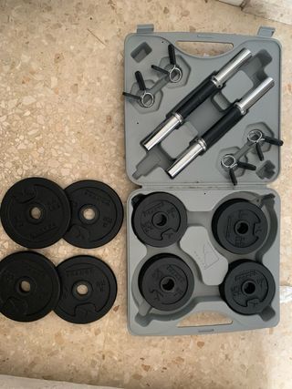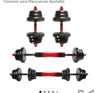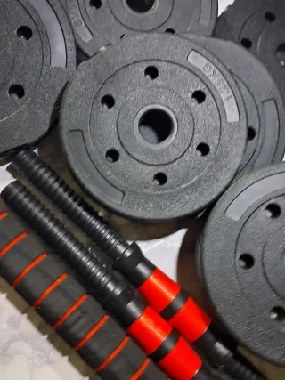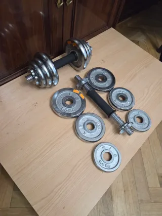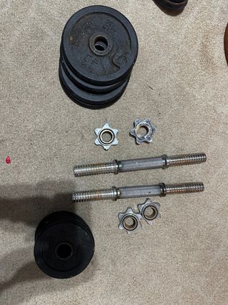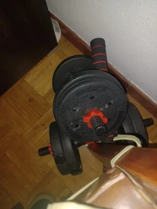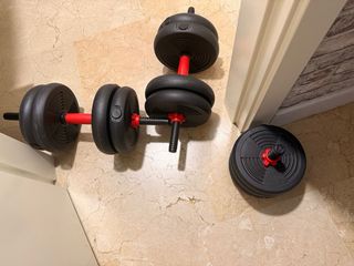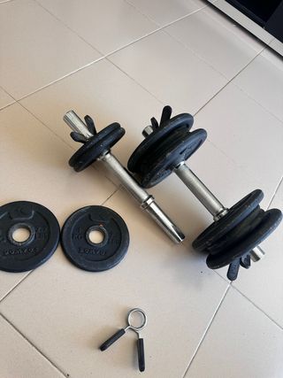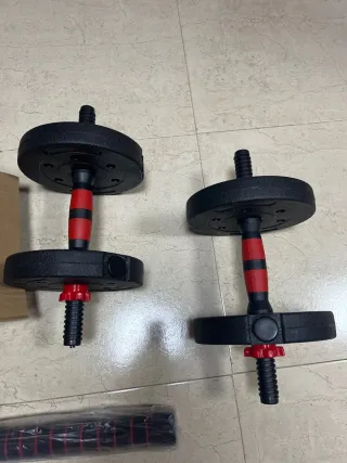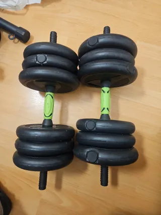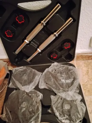 Set di manubri regolabili, perfetti per la tua routine di esercizi a casa. Include dischi e barre per personalizzare il peso. - Dischi di peso. - Barre per manubri. - Barra lunga per unire i pesi e fare sollevamento pesi. - Chiusure di sicurezza per i dischi. - Prezzo negoziabile