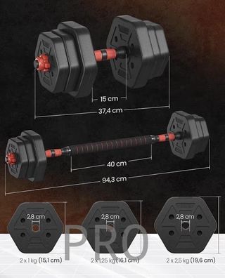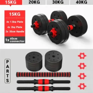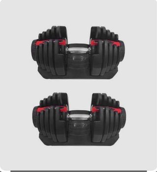 Set di manubri regolabili per allenamento a casa o in palestra. Permettono di variare facilmente il peso. Caratteristiche: Design moderno in nero e rosso da 2,5 kg a 40 kg, presse per panca (non mostrate in foto), supporto per remo con adattatore di barra, 2 barre lunghe, 4 dischi da 20 kg, panca Scott.