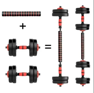 Set di manubri convertibile in barra con dischi da 1 kg quattro, 1,25 kg due, 1,5 kg due e due da 2 kg. Dischi rivestiti in plastica.