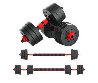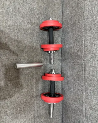 Set di manubri regolabili per le routine di esercizi a casa. - Dischi di peso neri. - Collegamenti rossi per fissare i dischi. - Barra di collegamento per trasformarli in una barra.