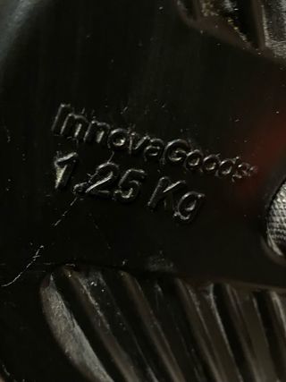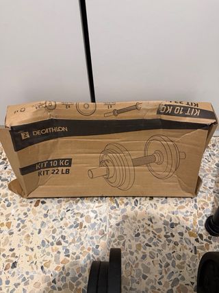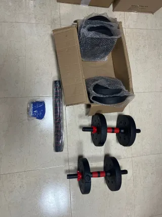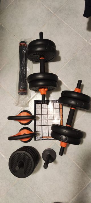 Set di manubri regolabili e barra. - Due manubri da 5 kg ciascuno. - Barra per convertire i manubri in barra. - Dischi di peso in plastica. Non è nella sua scatola perché l'ho usata una volta e ho gettato la scatola in cui erano contenuti.