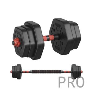 Set di manubri regolabili per l'allenamento a casa. Può essere trasformato in due manubri da 20 kg totali. Barra con impugnatura antiscivolo. Dischi di peso neri.