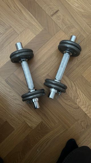 Set di manubri regolabili, ideali per l'allenamento a casa o in palestra. Permettono di variare il peso in base alle tue esigenze. - Pesi neri. - Barre con impugnatura antiscivolo. - Chiusure a vite per fissare i pesi. 10 kg su ogni manubrio.