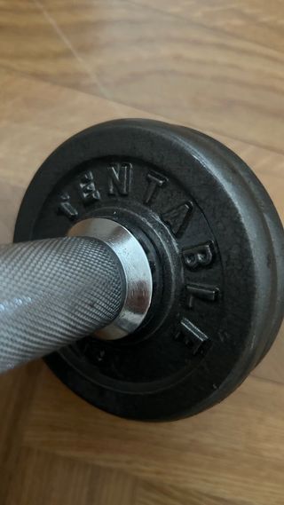 Set di manubri e pesi per allenamento a casa. Include barra e dischi. - Barra con impugnatura antiscivolo. - Dischi di diversi pesi. - Chiusure di sicurezza per i dischi.