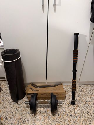 Set di attrezzature per allenarsi a casa. - Manubri regolabili con dischi. - Barra per trazioni a porta. - Tappetino arrotolabile per esercizi.