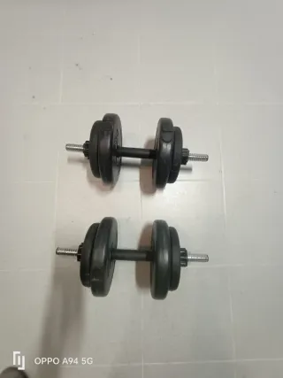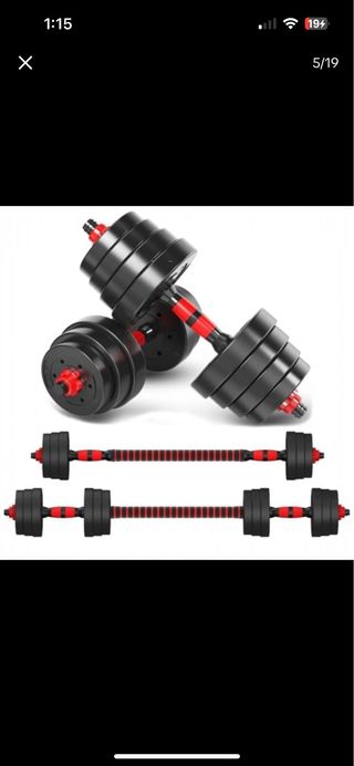 Set di manubri regolabili con dischi di peso. - Due manubri da 5 kg ciascuno. - Barra di presa con imbottitura. - Se ti interessano sia quelli da 5 kg che quelli da 7,5 kg, ti offro entrambi per 65€. Per qualsiasi domanda, non esitare a scrivermi.