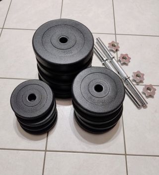 MANUBRI REGOLABILI: Scegli tu l'intensità dell'allenamento! Puoi facilmente montare e smontare i dischi pesi sull'asta e bloccarli con gli appositi fermi. Il set comprende 4 dischi da 5 kg, 4 dischi da 2.5 kg, 4 dischi da 1.5 kg e 2 manubri in acciaio da 2 kg ciascuno DIMENSIONI: Dischi da 5 kg: Ø24.5 x 4.3A cm. Dischi da 2.5 kg: Ø20.5 x 4A cm. Dischi da 1.5kg: Ø17 x 3.3A cm. Dimensioni connettore: Ø2.5 x 45L cm. Montaggio richiesto Ogni manubrio completo può arrivare a 20 kg
