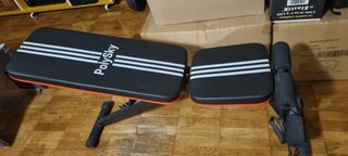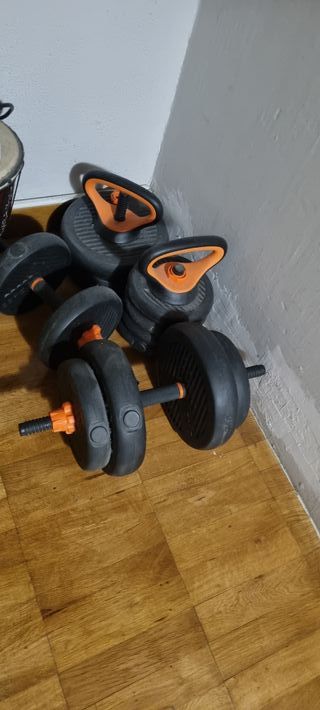 Set di manubri regolabili con pesi e panca per addominali regolabile più set manubi componibili con pesi da 2kg 2.5kg 5kg Portata max manubri 19kg vendo per inutilizzo 338209318 alessio - Manubri con dischi in plastica nera e arancione. - Panca per addominali con maniglie arancioni.