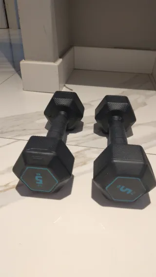 Vendo coppia di manubri esagonali neri, ideali per allenamento a casa o in palestra. Marca Decathlon. - Design esagonale per evitare che rotolino. - Impugnatura antiscivolo per una presa sicura. - Peso indicato su ogni manubrio.