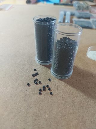 Set di perline dello stesso modello. In ordine di foto: arancio e magenta (piccole), azzurro metallizzato (piccole), viola (piccole), nero metallizzato (piccole), grigio (medie), rosa (medie), rame (grandi)